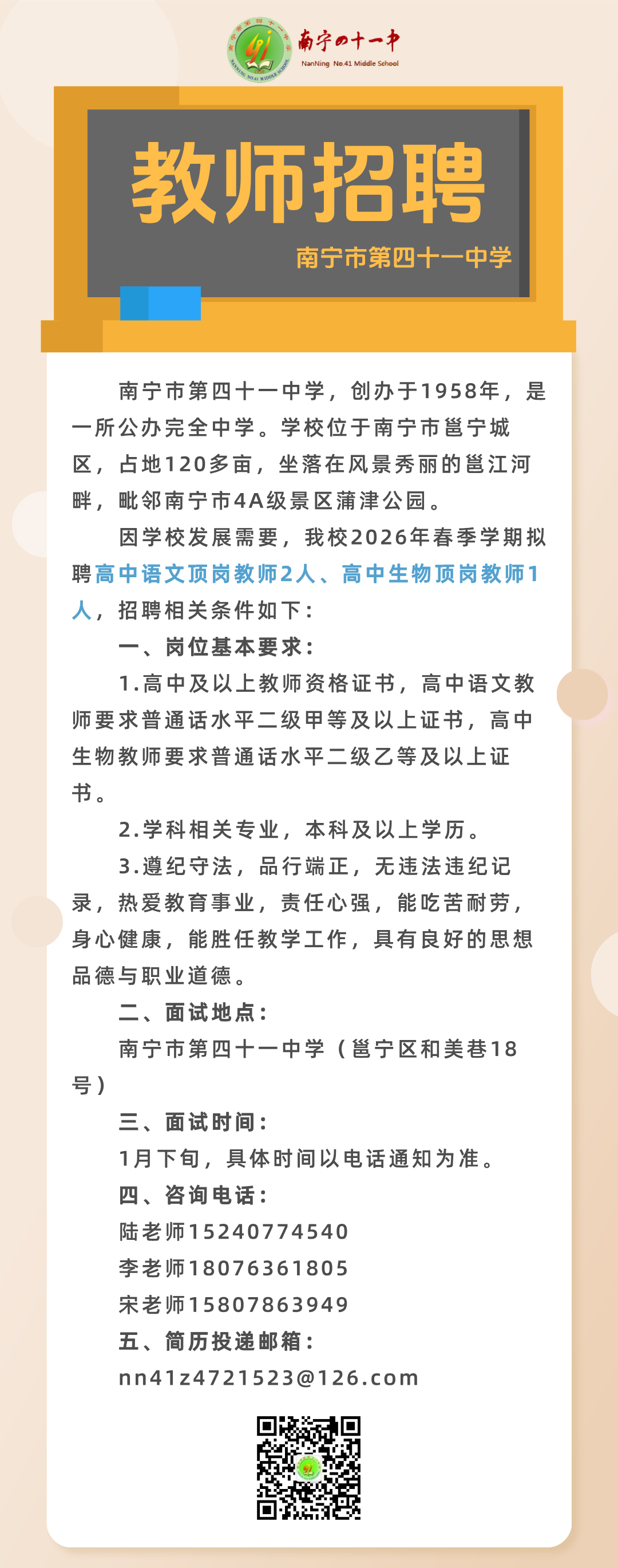 原标题:2026年春季学期南宁市第四十一中学关于公开招聘顶岗教师的启事