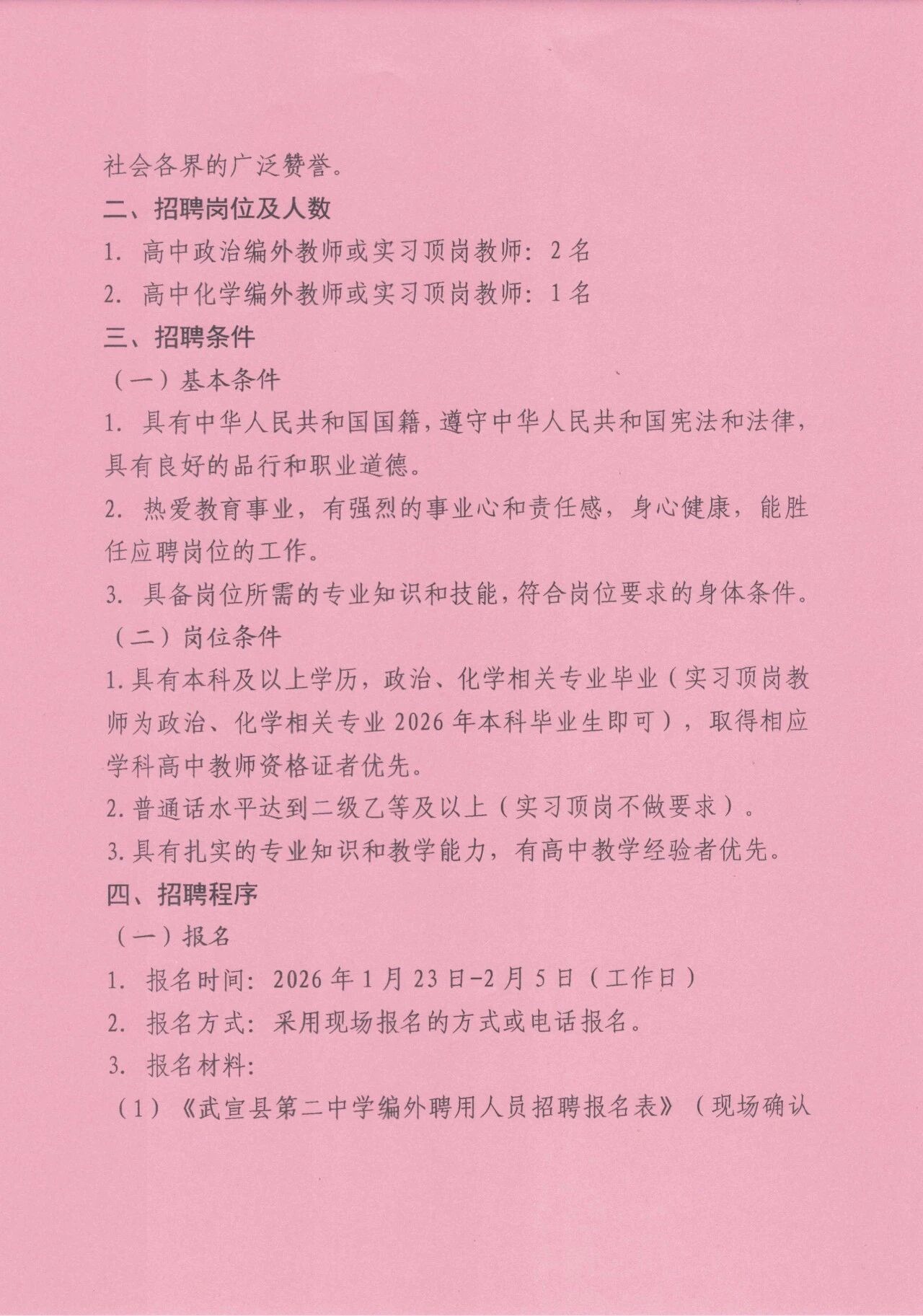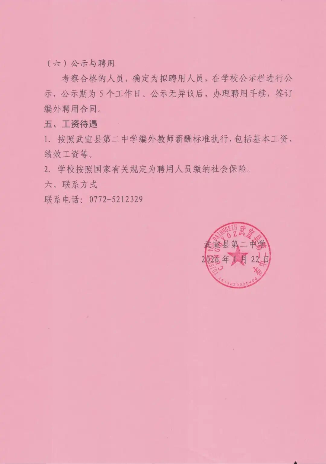 2026年来宾武宣县第二中学编外(顶岗)教师招聘3人
