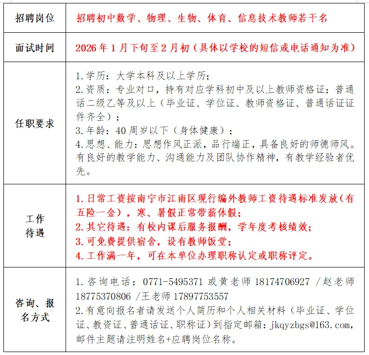 原标题:南宁经济技术开发区第一初级中学2026年春季学期教师招聘公告