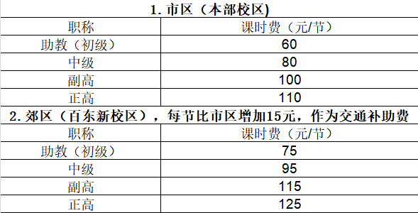 担任外聘兼职教师的待遇按实际工作量计发。按校区和职称的高低给予不同的标准,以签订兼课协议为准。计发标准如下: