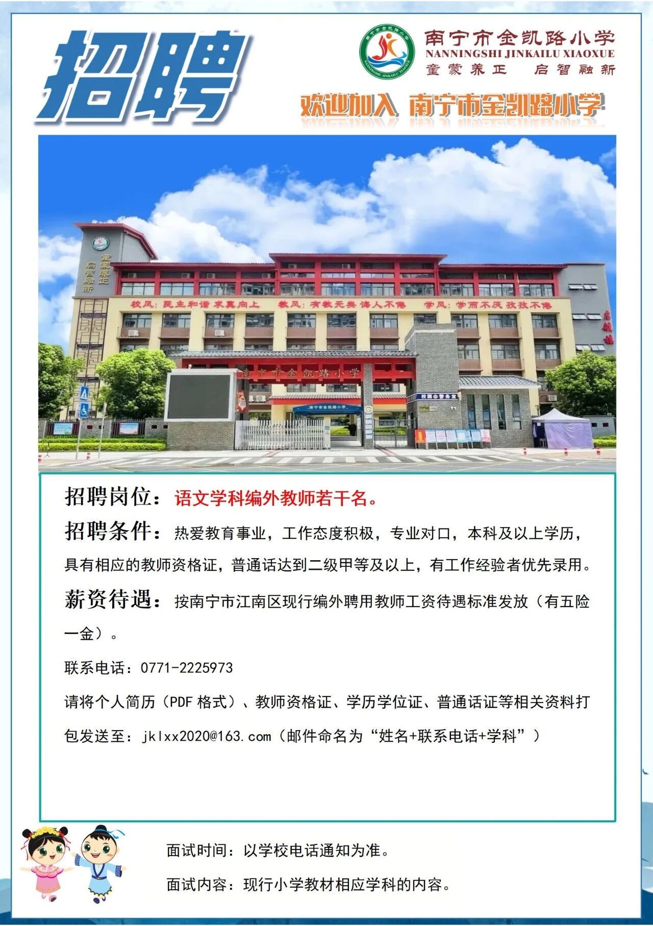 原标题:2025年南宁市金凯路小学招聘语文学科编外教师若干人