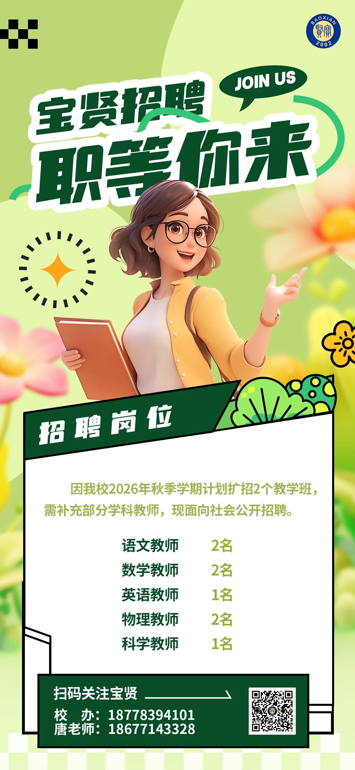 4.取得初级中学以上教师资格证,具有良好的身体和心理素质,体检符合教师资格认定标准,对教育有理想追求,理解并愿意践行桂林市叠彩区宝贤学校办学理念。应聘程序
